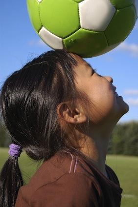 Coaches, introduce this skill with simple balancing of the ball on the correct part of the forehead as seen in this photo: